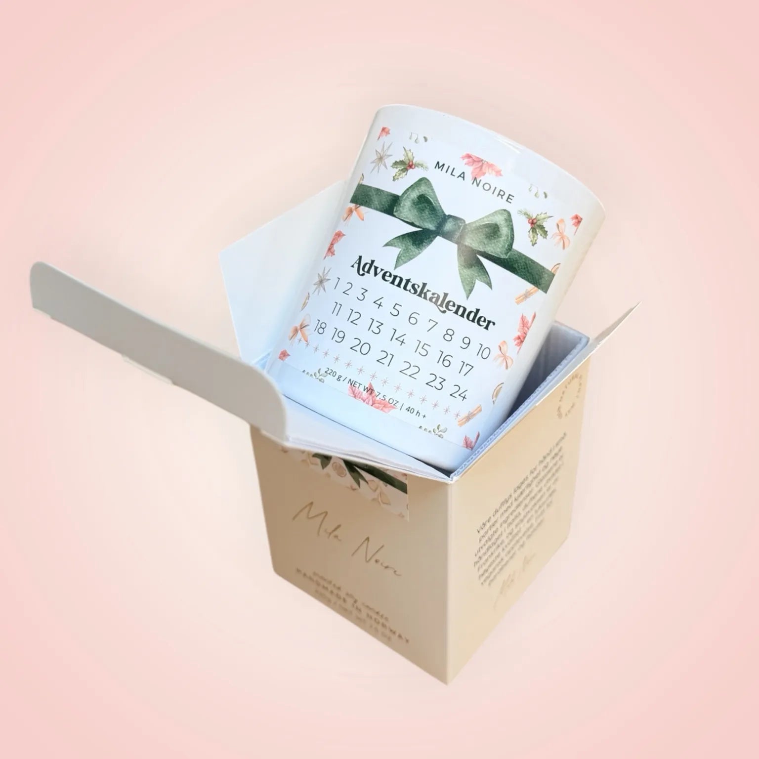Dette julekalender–duftlyset har en etikett med avkrysning for tall – kryss av hver gang du tenner lyset og gjør det til en enkel, koselig rituale i advent.