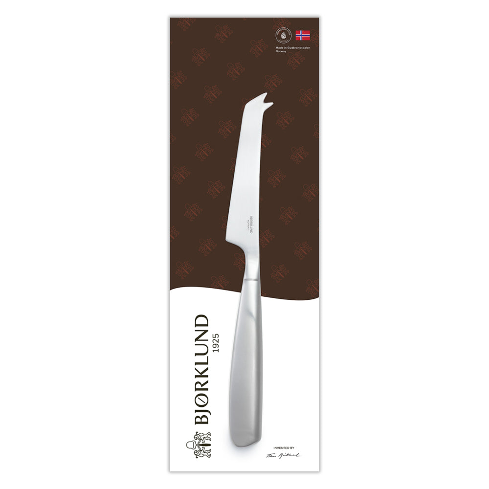 Kvitfjell ostekniv i stål leveres festet i en bakeplate i papp, som gjør den til en fin gave. På baksiden av platen står blant annet historien bak ostehøvelen.