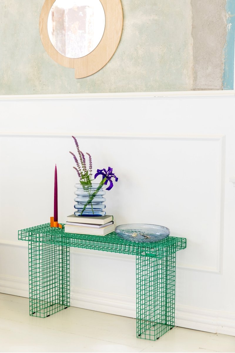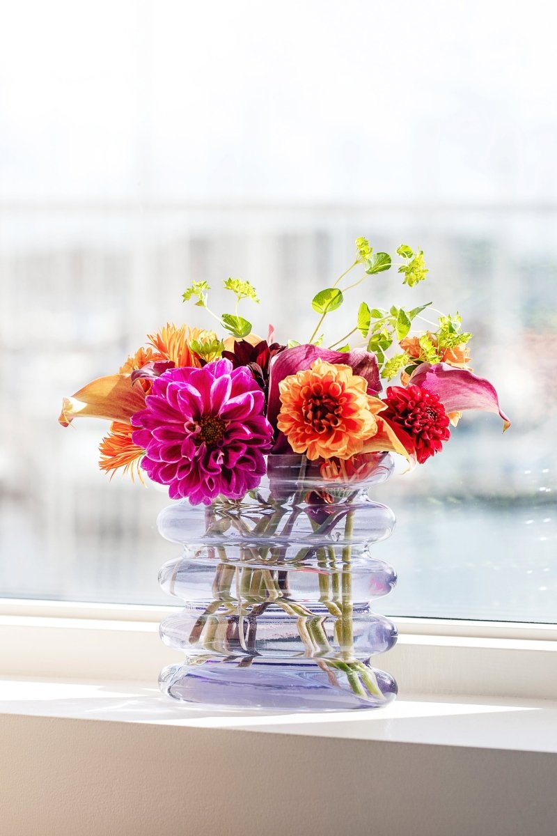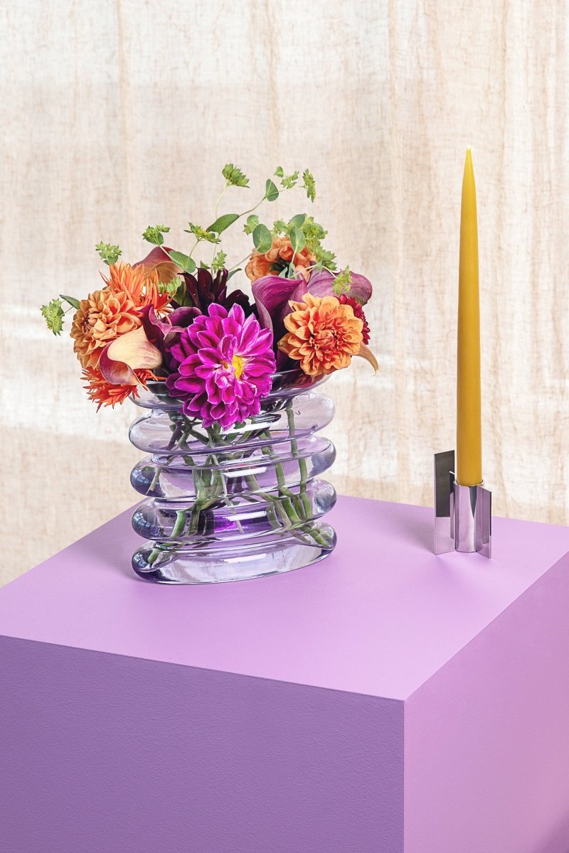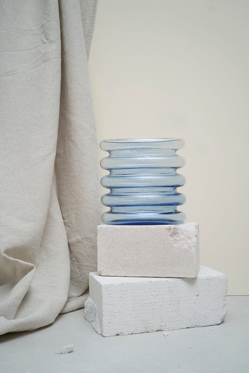 En bølget silhuett kombinert med farget glass er oppskriften på Repeat Vasen. Et lett og lekent uttrykk som løfter innredningen. Den blålilla fargen kan enkelt kombineres med andre nyanser og materialer i hjemmet. Med sin langstrakte åpning utfordrer designet den klassiske vasen, og gir blomsterbuketten muligheten til å falle på nye, spennende måter.