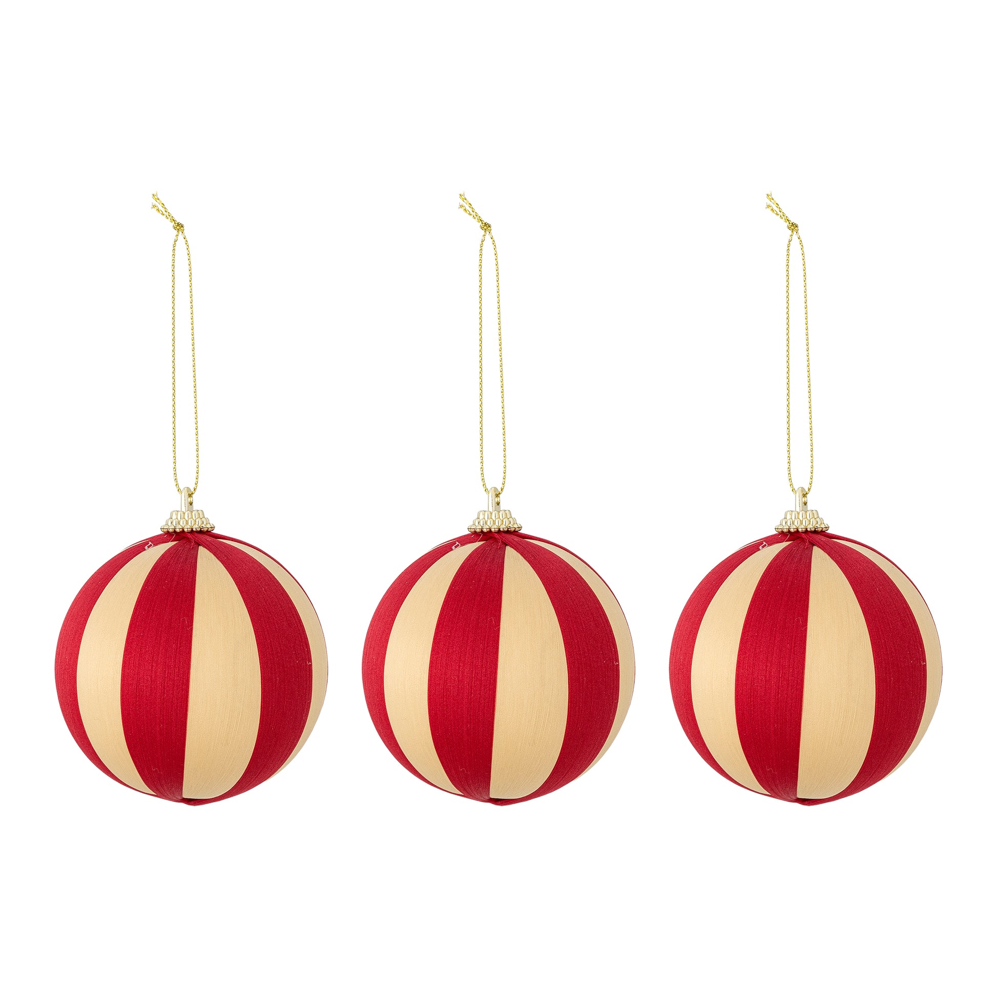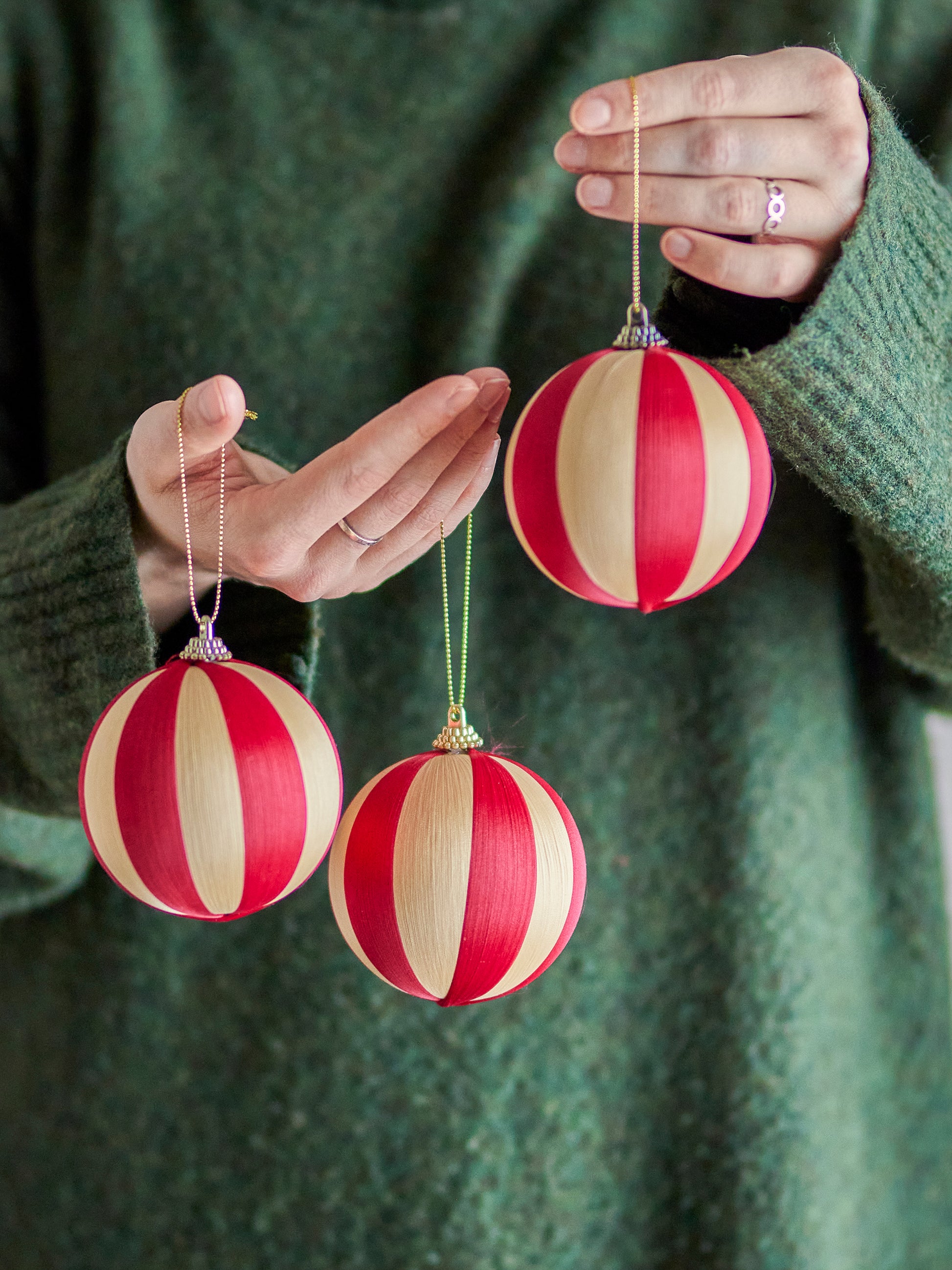 En pakke med tre lekre, lette, julekuler surret inn i tynne og elegante tråder i rød og beige.